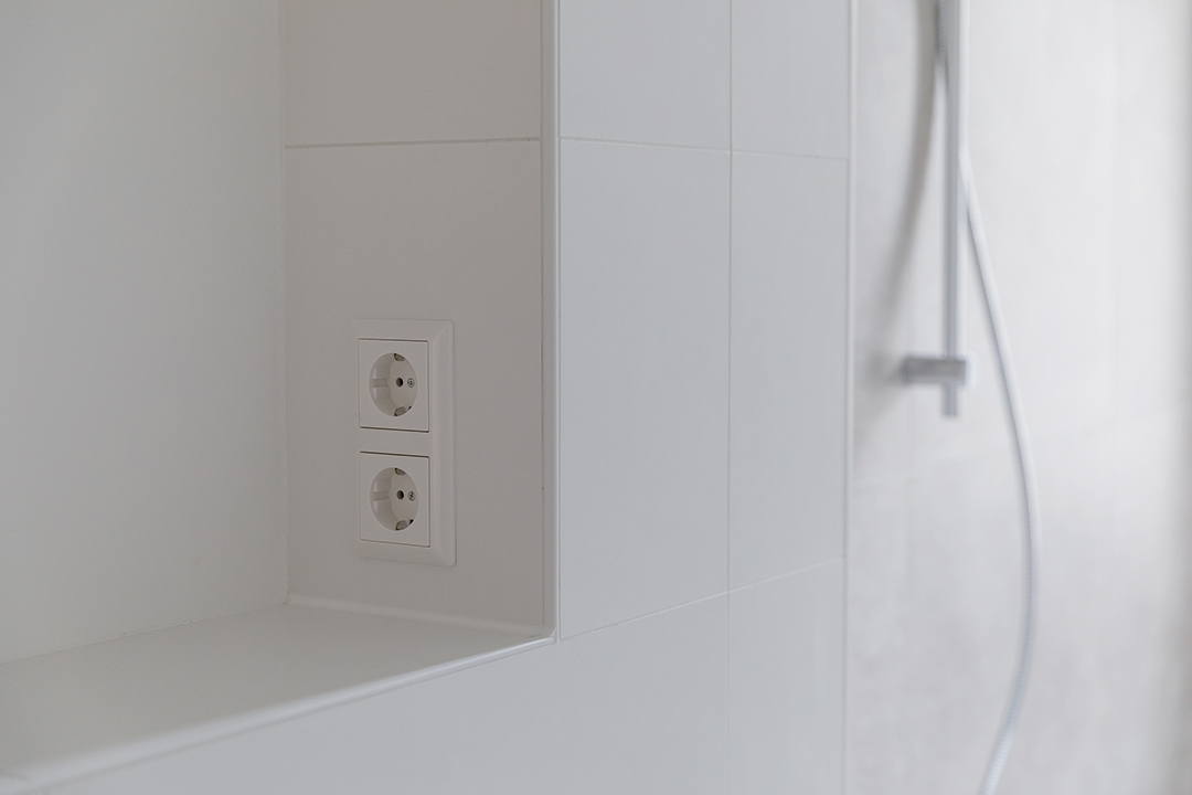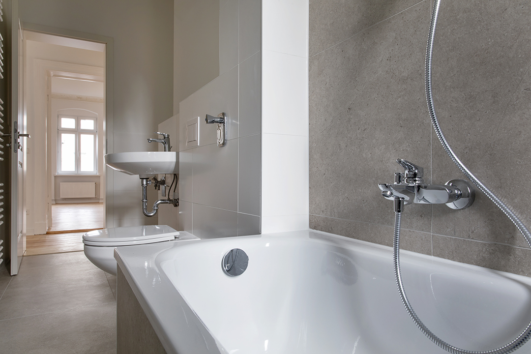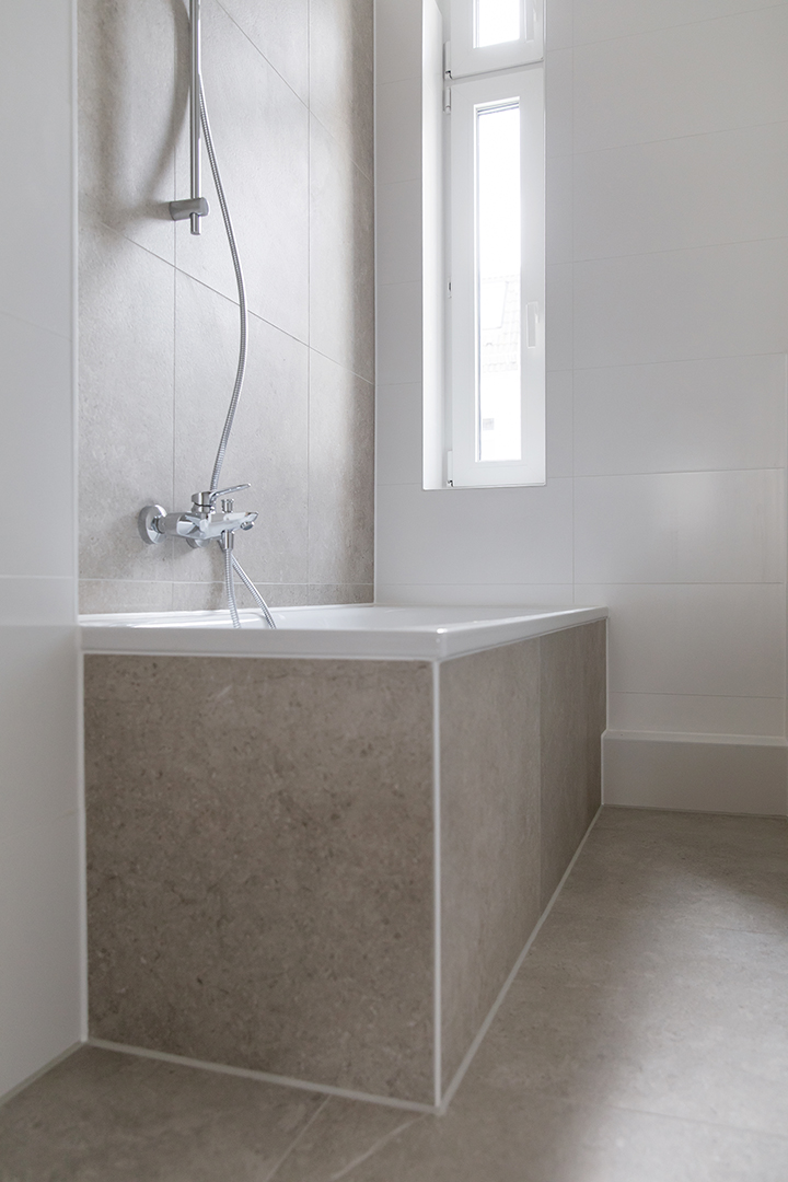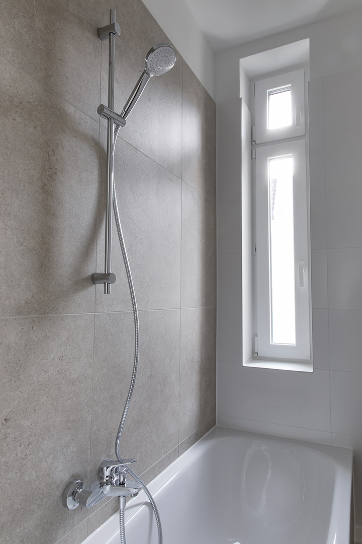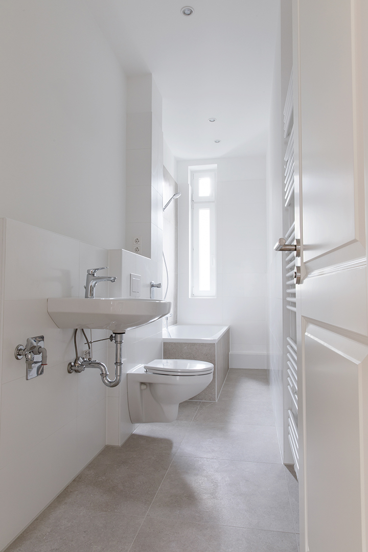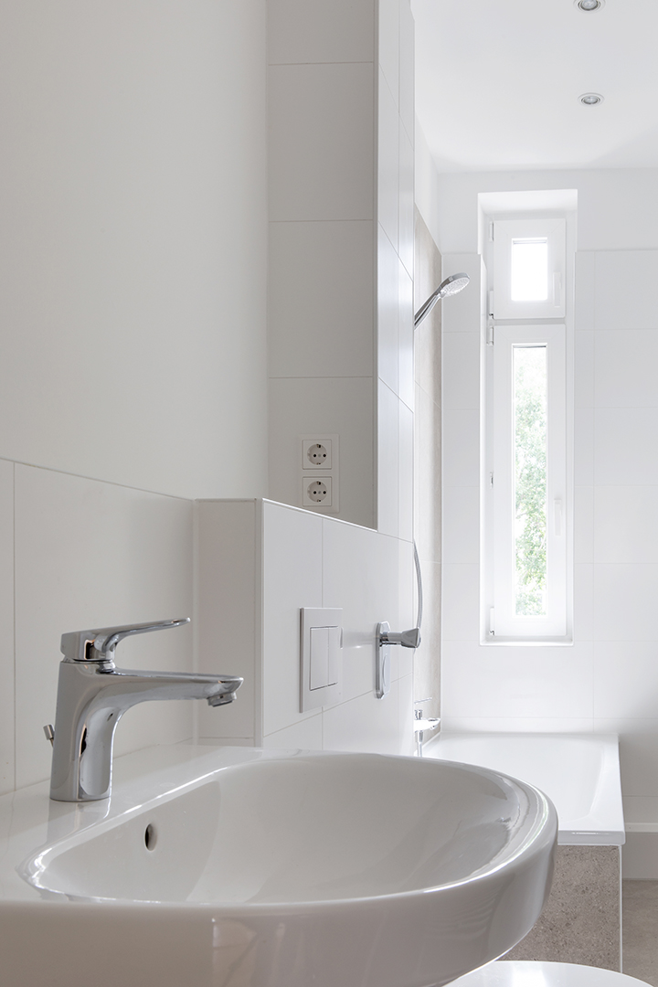 Der Zustand des Bades vor dem Umbau erinnerte an die Filme „Sonnenallee“ oder „Good Bye Lenin“ – eine hervorragende Filmkulisse also. Doch wer möchte schon in einer Kulisse leben. Deshalb wurde zunächst überlegt, wie aus dieser matten Perle wieder eine Glänzende geschaffen werden kann, natürlich auch im Hinblick auf Funktionalität in Verbindung mit zeitlosem Design. Zunächst wurde aus drei Räumen – Bad, Kammer und Küche ein Raum geschaffen. Das wurde dazu genutzt den Boden des Raumes auf Zustand und Beständigkeit zu prüfen. Danach bekam der Raum erneut eine Wand, welche Bad und Küche voneinander trennt. Auf der anderen Seite zum angrenzendem Zimmer wurde ein Stück Wand versetzt, um eine Nische für die Waschmaschine zu schaffen. Nun strahlt das Bad mit Badewanne heller als je zuvor, wobei für den Boden 60×60 Feinsteinzeugfliesen im warmen Erdton ihren Platz fanden, die sich auch an Badewanne und Rückwand wiederfinden. Eine angenehme Nuance zu den hellen 30×60 rektifizierten Wandfliesen aus Steingut. (Rektifizierend meint eine bestimmte Form der Kantenbearbeitung) Die Decke wurde abgehangen und mit Lichtern versehen, um den kleinen Raum mehr Helligkeit zu verleihen.
