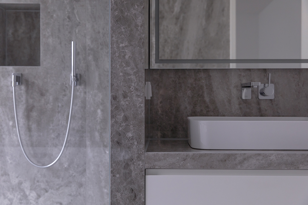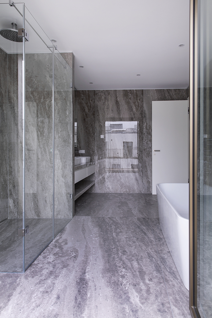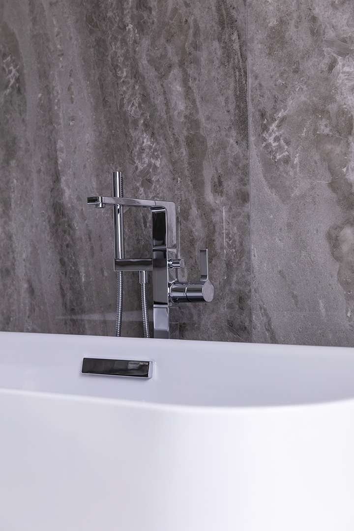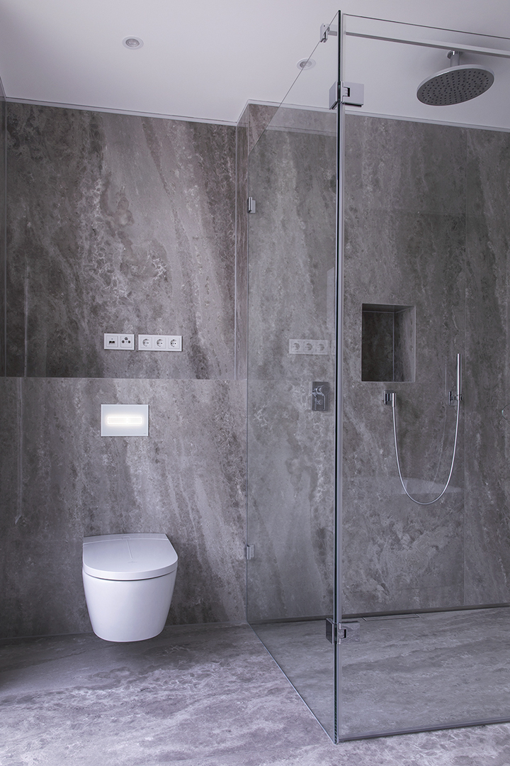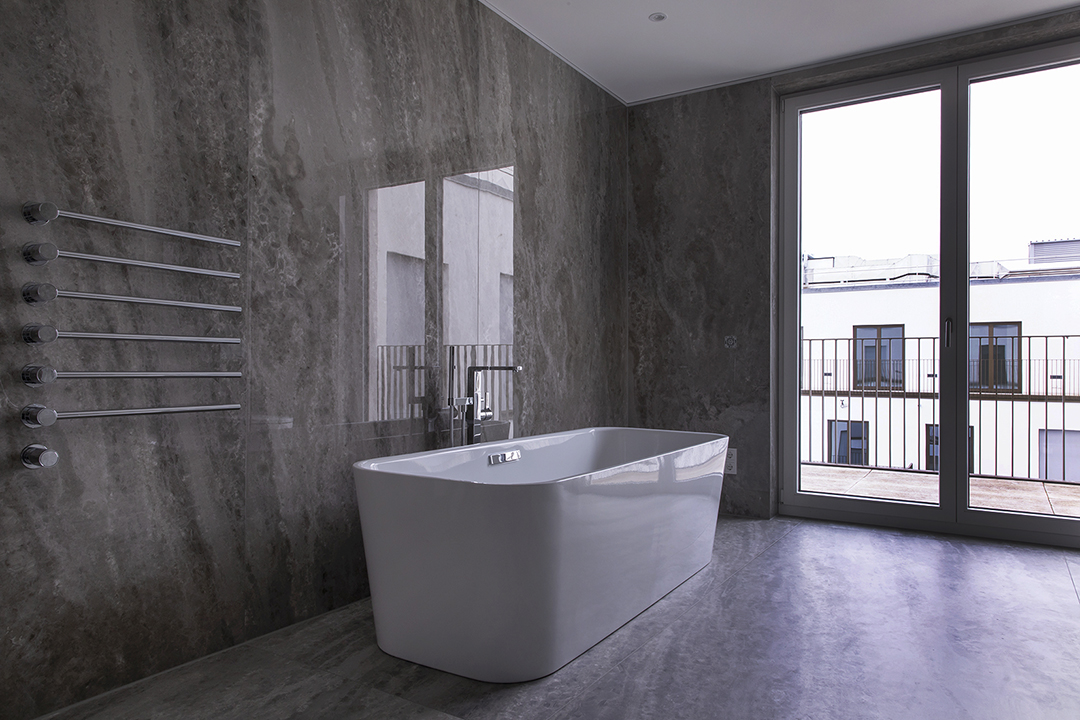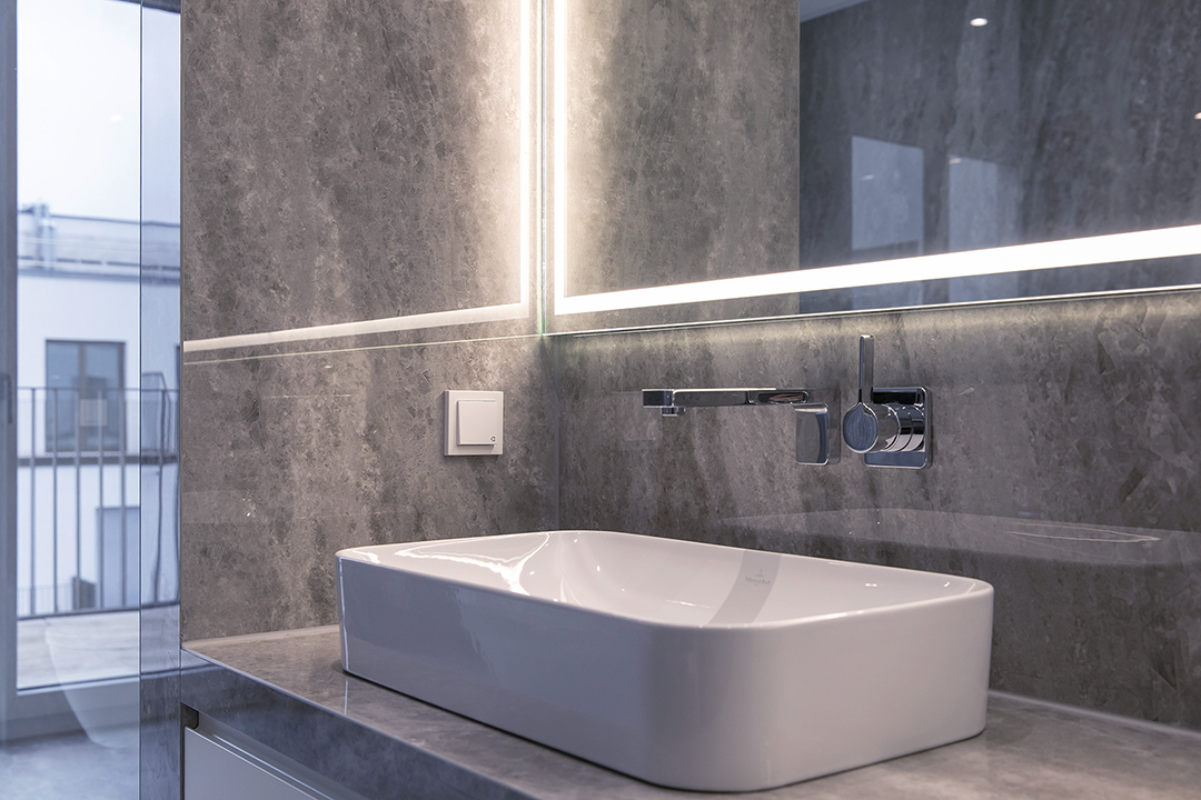 Auf Social Media wurde über dieses Penthouse gesagt, dass es das 2. Teuerste von ganz Berlin sei. Und dafür ist unserer Meinung nach nicht nur die Größe oder Lage ausschlaggebend, sondern auch die hochwertige und luxuriöse Ausstattung der Bäder. Wobei allerdings erwähnt werden sollte, dass eine gute Vorbereitung, wie die Verlegung von Elektro- und Wasserleitungen oder der professionelle Einbau der Wandverkleidungen das A und O sind. Das Penthouse hat zwei Bäder und ein Gäste WC. In allen drei wurden grossformatige Feinsteinzeug Platten in 120×280 verlegt, an den Wänden glänzend und auf den Böden matt (rektifiziert). Das Highlight des geräumigen Badezimmers ist die freistehende Badewanne (Bette Art) und wer lieber ebenerdig duscht, kein Problem, auch eine Dusche ist vorhanden. Der Handtuchhalter (Vola) ist ein artifizieller Hingucker und dazu noch äußerst praktisch. Weiter geht es in Teil 02.